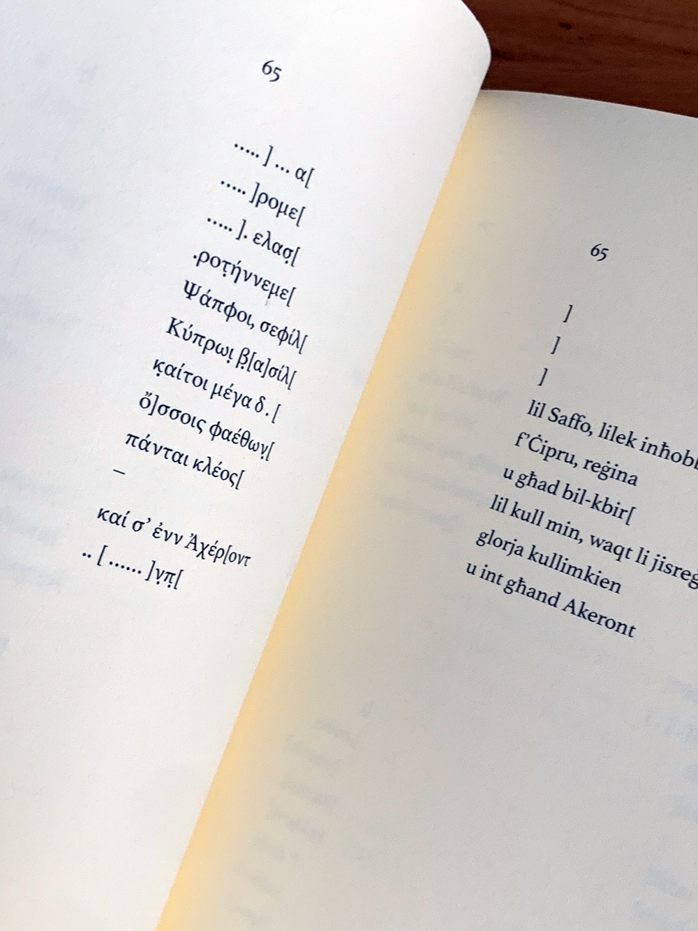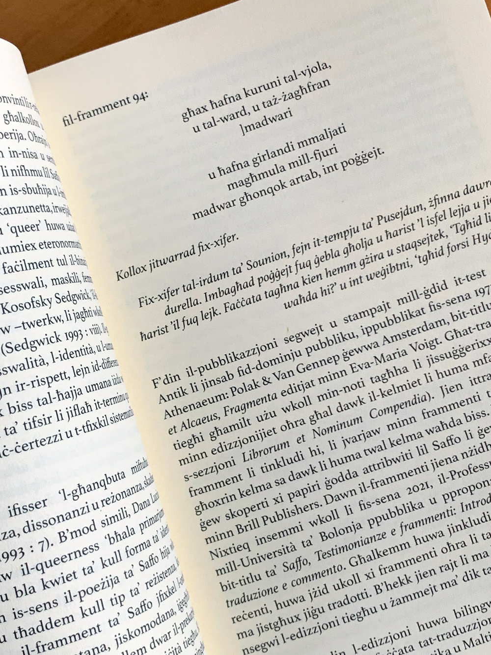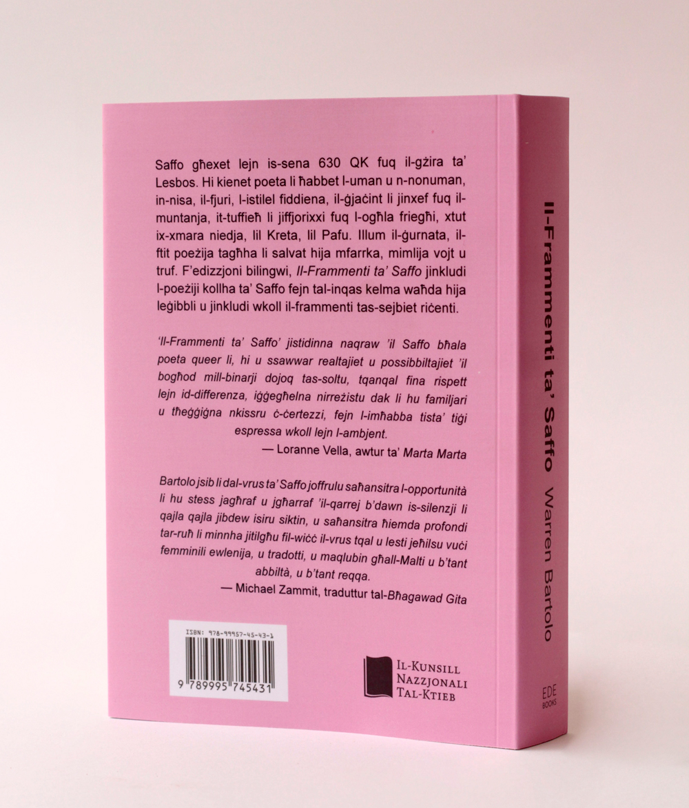 F‘Il-Frammenti ta’ Saffo (2023), Warren Bartolo jiġbor u jittraduċi l-poeżija ta’ Saffo mill-Grieg Antik għall-Malti. Il-pubblikazzjoni tinkludi wkoll Introduzzjoni, esej dwar it-Teorija tat-Traduzzjoni u l-Impossibbli, kummentarju dwar il-frammenti, u appendiċi li jinkludi l-iktar sejbiet riċenti tal-poeżija ta’ Saffo. Edizzjoni bilingwi bil-Grieg Antik u bil-Malti. Dan il-proġett kien iffinanzjat kollu mill-Kunsill Nazzjonali tal-Ktieb ta’ Malta u ppubblikat minn Ede Books, 2023. Grazzi speċjali lill-Ägyptisches Museum und Papyrussammlung f’Berlin, il-Ġermanja, u lill-pubblikaturi Brill f’Boston, l-Istati Uniti.